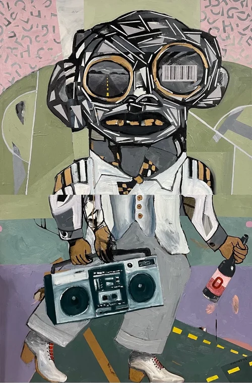 “Heads” references the human head as the seat of thought and the mind’s ability to handle multiple ideas simultaneously. In order to visually represent this, I have painted these heads metaphorically to mimic robots, traditional African sculptural forms, and tubular machines.